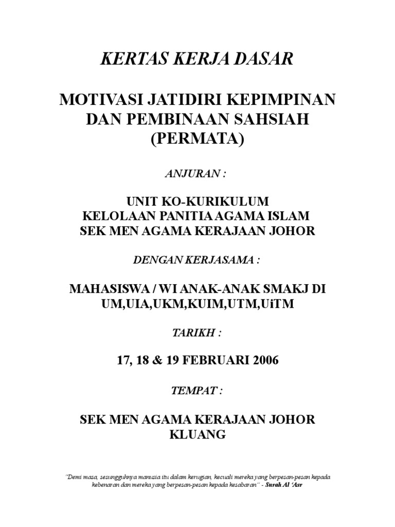 Kertas kerja kursus kepimpinan fbru 2012. 24 26 Januari 2012 Tempoh. View KERTAS KERJA MOTIVASIpdf from PUBLIC MANAGEMENT 1013 at Universiti Utara Malaysia.